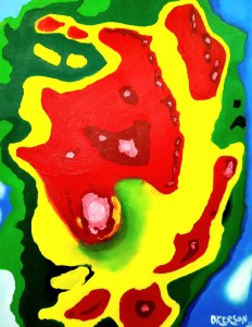 Okerson began painting as a way of coping with anxiety and depression. A career plan was thwarted due to the 2011 tornado, and the later governmental closing of his chosen educational institution left him unable to complete his degree.