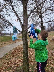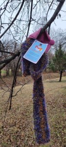 Scarves are draped on trees, over bridges and on other locations around the three communities. They are tagged with an invitation for anyone to claim ownership of the scarf and winter accessories attached.