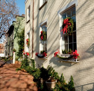 I have always loved the look of wreaths hanging on the outside of the windows of a home. It brings such warmth to the look of the outside, in my opinion. The addition of the window boxes filled with greenery and red ribbon certainly make these windows stand out with Christmas charm. If you don’t have window boxes, you could still hang the wreaths and then fill pots, used for summer flowers, with a small green tree instead and tie bright red bows on the branches and around the base for added color. Or purchase the outdoor-grade ornaments and hang red balls from the branches. I personally love red cardinals and would love to see a few of those hanging from the branches of the small tree. It would make a beautiful addition to this outside display.