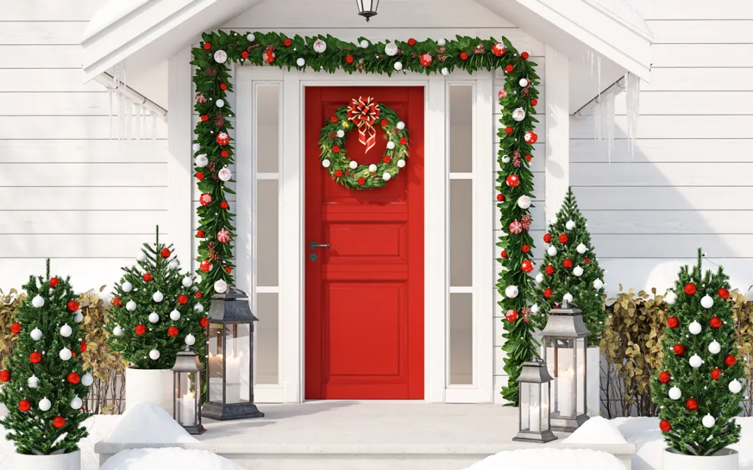 Red, green and white are the classic Christmas colors. The look of the outside of this home with classic red and white ornaments strung throughout the green garland and added to the wreath and onto the small trees outside the home ties the whole look together. By adding the lanterns filled with flameless candles, you have an entrance that is beautiful day and night.