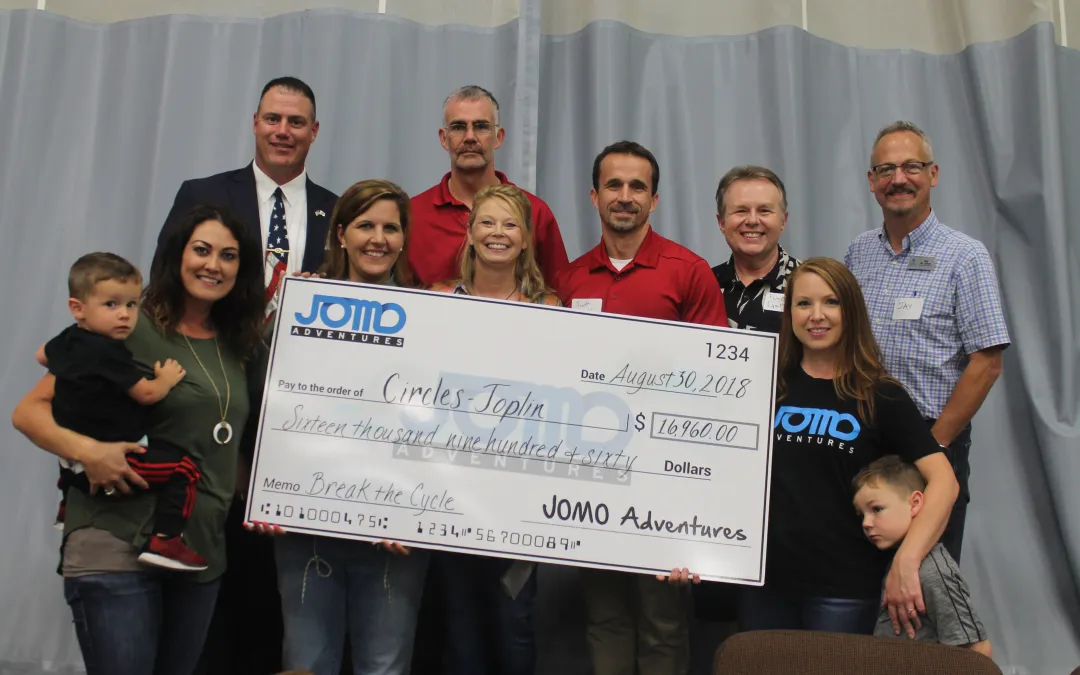 Three local groups—SNC Squared, Joplin Elk’s Lodge, and JOMO Adventures—presented donations totaling over $18,000 to Circles-Joplin to support poverty elimination efforts. The funds were raised through events like a dunk tank, charity breakfast, and a bicycle ride.