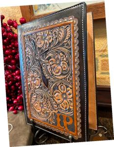 Yet it is the Bible cover he enjoys working on the most. “I really like visiting with the client and showing them the patterns I have,” he said. “If they want something different, then I will ask for a picture to work from and work up a sample sketch. If they have a particular brand, then I will incorporate that into the design.”