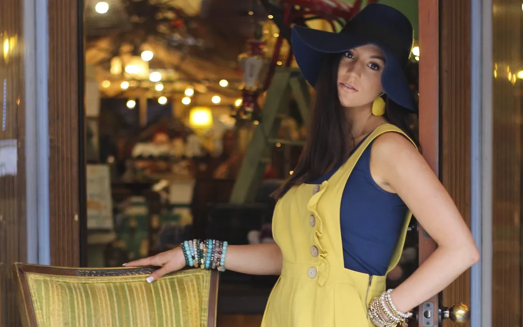 Kenna embraces spring in stylish chartreuse overalls, a navy tank, and a floppy hat. Wide-leg crops and boots add charm, while handmade leather earrings and stacked bracelets complete her boho vibe.