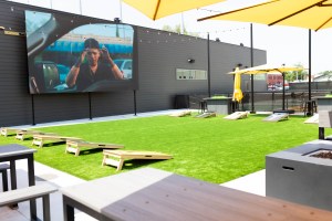 Tee Time is a destination for those who want to catch the latest games on their giant screen in their courtyard. The firepits, cornhole and yard games add to the atmosphere of being a hub of activity for families and grownups.