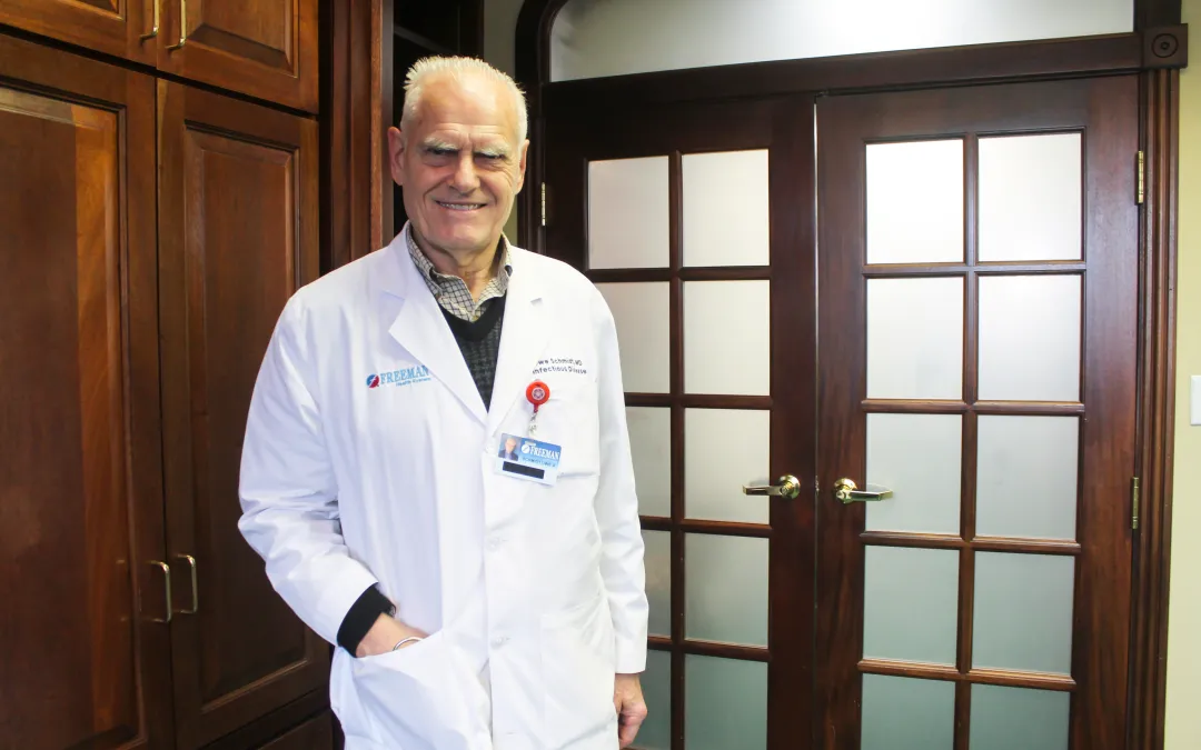 Dr. Schmidt came to Freeman in 2009. Each day, he makes rounds at the hospital and sees patients in the office. In the fall and winter, he often sees patients for pneumonia and the flu, including treatment to arrest necrotizing pneumonia, which can be fatal. In the summer, he sees many patients for tick-borne diseases and has even treated the very rare Heartland virus.