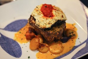 My filet was topped with a crab and mascarpone-stuffed portabella, fire-roasted red pepper butter sauce, drizzled white truffle oil and roasted root veggies. It was every bit as good as it sounds.