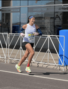 “I didn’t really start to love running until the summer before my freshman year of college,” she says. “I was in a toxic relationship and got to the lowest point of my life. I learned how to use running as a coping mechanism. I love what running does for me even on the days I have to fight to find motivation to get out and run. I am grateful to have a wonderful coach who challenges me in my running regularly.”